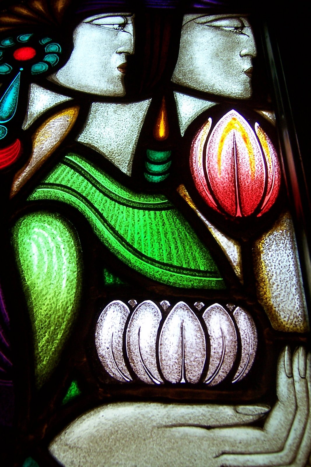 The stained glass window is in the wedding room of what used to be the town hall. Now it is a fancy hotel but you can still get married there. What struck me was the white lotus and the red tulip/