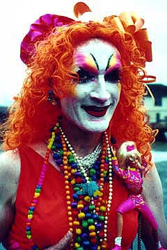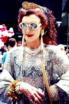 The Bloolips were a troupe of anarchic gender bending actors, performing hilarious spoofs on sexuality and society. They were outrageously camp, appearing on stage in costumes that had audiences screaming with laughter, usually made of recycled junk (my favorite was a dress made entirely of rubber gloves). They were subversive, warm and fuzzy at the same time. They were mostly gay men, but appealed to all sexes, genders, and orientations. Hardcore lesbians were known to swoon when watching company member Lavinnia Coop perform. Each performer brought his own unique style and charm to the work.