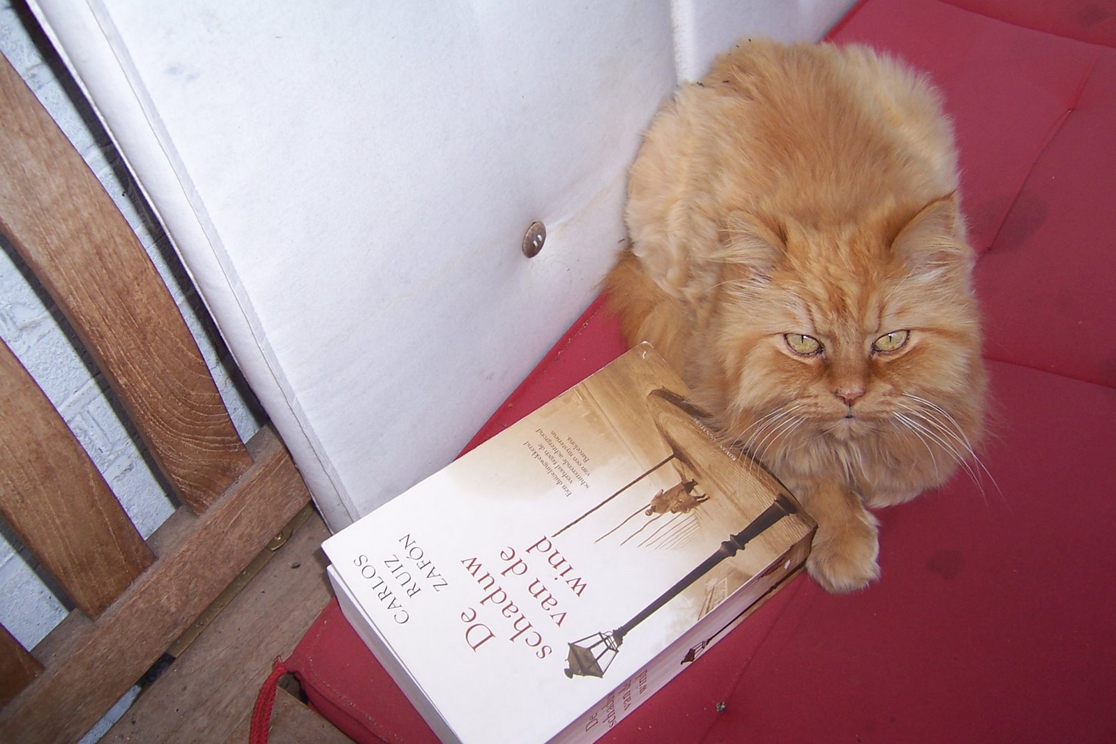Midas on the couch in the garden guarding The Shadow of the Wind