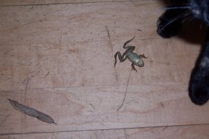Terwijl ik zit te denken of ik nu laf ben komt mijn kat Sterretje vrolijk binnen. Ze speelt met iets. Iets dierlijks. Is het een platte muis? Nee het is een kikkertje. Of een pad. Een baby pad. Doodstil ligt het diertje met de pootjes stijf. Sterretje laat hem liggen en aan het geklepper van het kattendeurtje hoor ik dat ze weer naar buiten gaat. Ik roep haar nog. Het beestje moet weg maar natuurlijk luistert Sterretje niet naar me. Sterretje besteedt er geen aandacht meer aan.