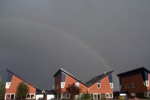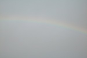 Zo gaat dat met water en zon. Aan de ene kant schijnt de zon en recht tegenover is de regenboog. In het midden regent het. Altijd mooi.