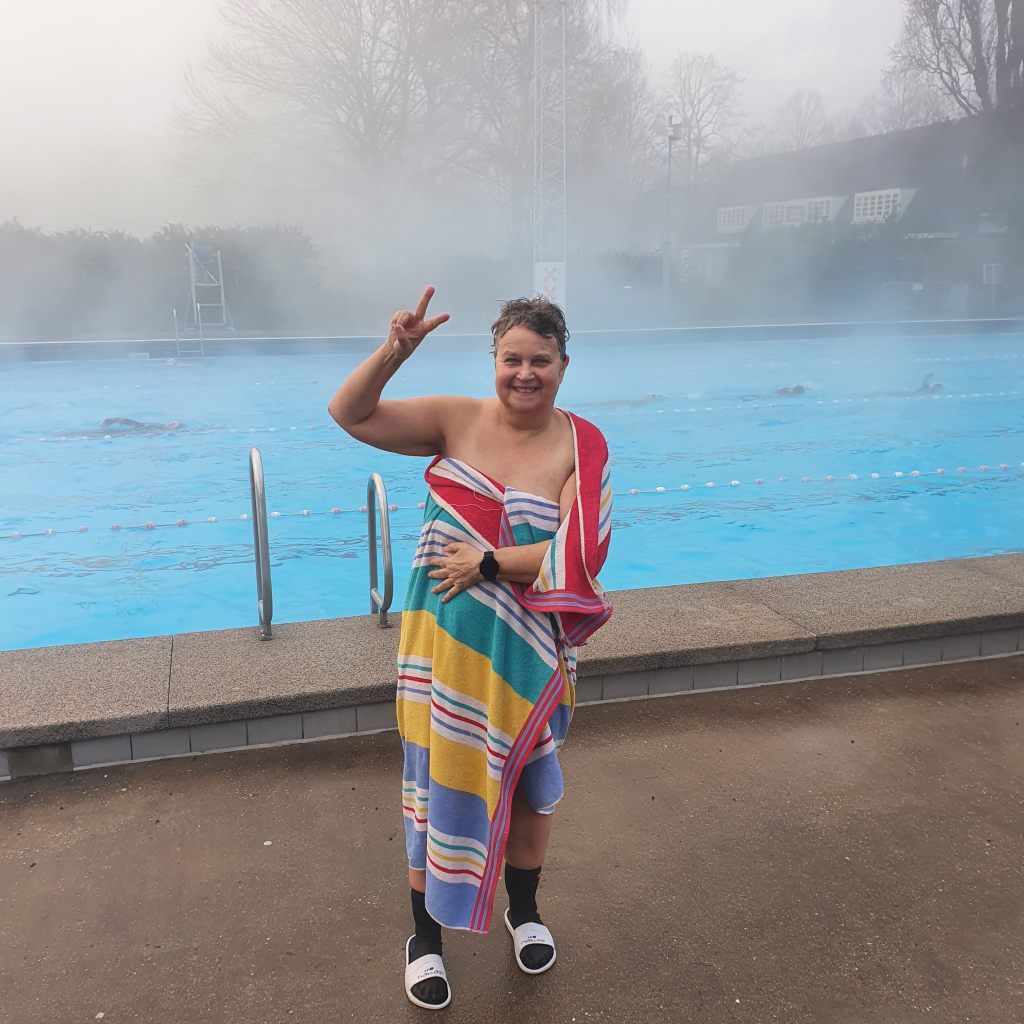 Vier banen waarin we over de ene zwarte baan heen gingen en over de andere terug. Gelukkig voor mij ging het De Mirandabad niet dicht op de gebruikelijke datum. Volgens mij was het mooi weer, er was nog steeds een gedeeltelijke lockdown al waren de binnenbaden wel weer open. Elke week werd besloten het bad nog even open te houden. Nog steeds, inmiddels in januari, is het open, als enige bad in Nederland. Overal vandaan komen mensen om te zwemmen in het De Mirandabad. Elke dag is het uitverkocht en inmiddels is het zo razend populair dat de 450 plekken voor volgende week zaterdag binnen 18 minuten waren uitverkocht.