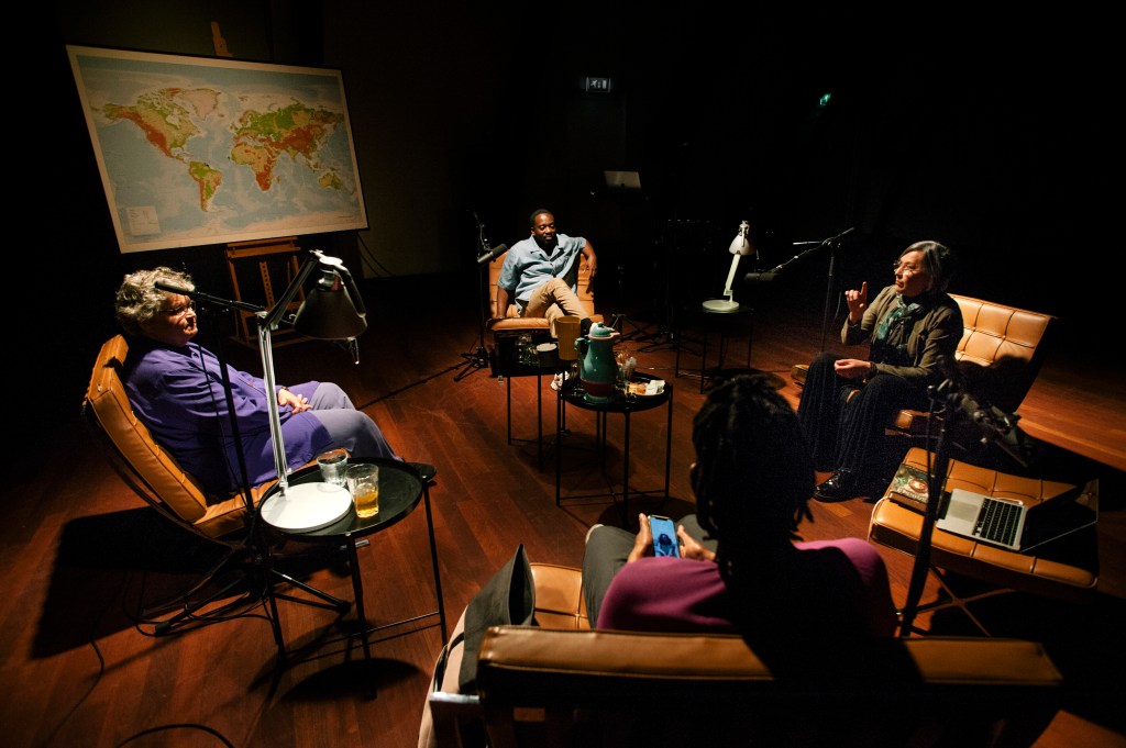 Op een zolder boven in Het Nationaal Theater zit ik in een donkere studio. Er staan vier lichtbruine stoelen met twee tafels tussen de stoelen en twee tafeltjes in het midden met op de een een thermoskan met grote glazen en op de ander een waterkan met kleine glazen. Naast elke stoel staat een schemerlamp met een licht dat naar beneden schijnt en een microfoon in een standaard.