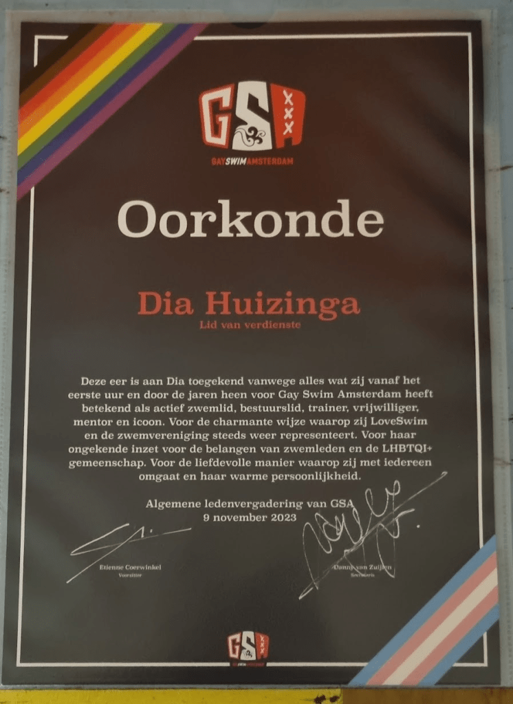 Toen zei de voorzitter: Ja en dan Dia, we willen het hebben over Dia. Ons oudste lid. Ons icoon. Die altijd overal aan meedoet, zich inzet en zo ging hij door. De loftrompet. Over mij. Wel vijf minuten lang of misschien wel langer.
