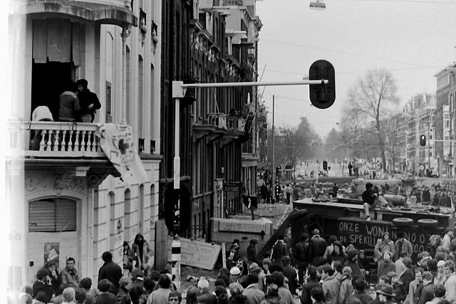De brug ligt vol klinkers en er zijn barricades opgeworpen op de hoek van de Roemer Visscherstraat. Hier geen overwinnings- roes. Eerder een opgefokte gespannenheid. Aan de gevel van het gekraakte pand hangt een buitgemaakte politiepet. Een groepje jongens praat, voor ons onhoorbaar, indringend in op een dronken maat die lallend achterover hangt. Een groep ineen gestrengelde figuren zit bij een olielamp naar een kleine transistorradio te luisteren. Een warm aangeklede jongen met een zwarte helm op zijn hoofd houdt ons tegen. ‘Wat komen jullie doen?’ ‘Kijken,’ antwoord ik. ‘Voor pottenkijkers hebben we geen plek. Wegwezen.’ Hij draait zich om. Hij is uitgepraat. Uit het groepje ineengestrengelde figuren maakt zich een gestalte los. Ik herken Tilt, een vrouw die ik ken uit het vrouwencafé. Ze klimt over de barricade en loopt een stukje met ons mee. ‘Ze zijn opgewonden de mannen, het testosteron giert ze door het lijf. Ze verwachten de ME, en willen lekker vechten, boys will be boys.’
